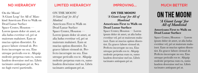 Hierarchy is “a system or organization in which people or groups are ranked one above the other according to status or authority.” Many of us understand this concept in terms of company org charts or even Maslow’s hierarchy of needs (I also did a previous blog post about my interpretation). It is used by designers like me to communicate the right things in the right order. This is not to be confused with Brand Architecture which is how multiple brands are organized with parent companies.